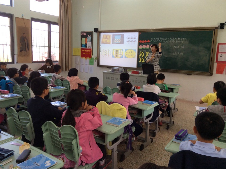 这次活动首先由高文蔚老师在三(1)班执教了《认识几分之一》。认识分数对三年级的孩子来说不是第一次接触,在上学期的时候学生已经初步认识了分数。高老师在此基础上进一步让学生认识到:把一些物体看作一个整体平均分成几份,其中的一份就是整体的几分之一。