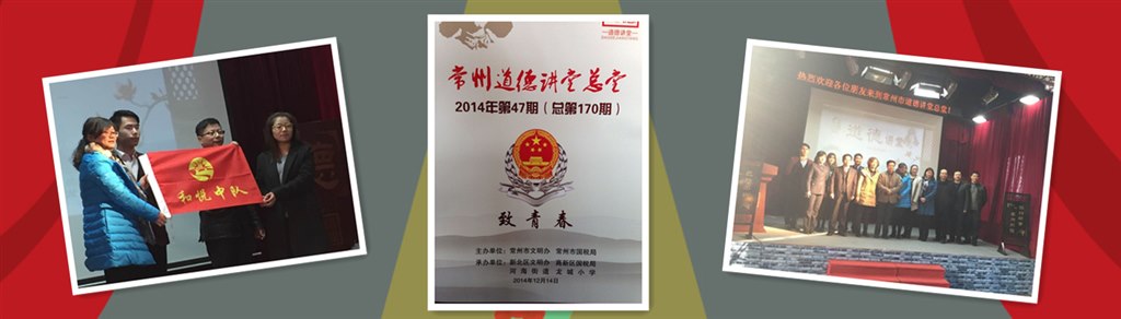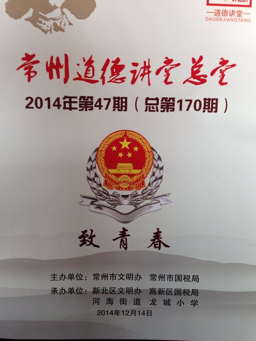 2014年12月14日,常州市龙城小学参加了常州道德讲堂总第170期的宣讲——致青春。常州市文明办、新北区文明办、常州市水利局长江处、高新区国税局、新北区河海街道和常州市龙城小学的领导都来到位于文化宫的道德讲堂总堂大成殿,聆听了此次宣讲。