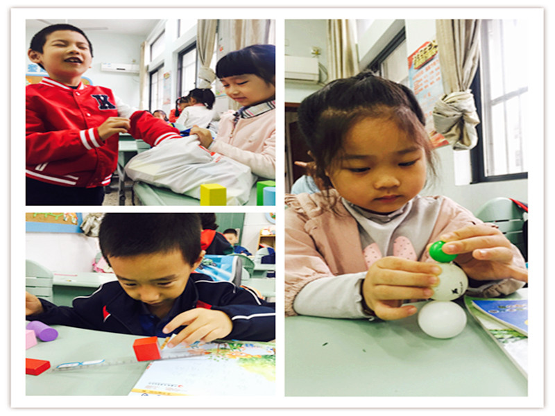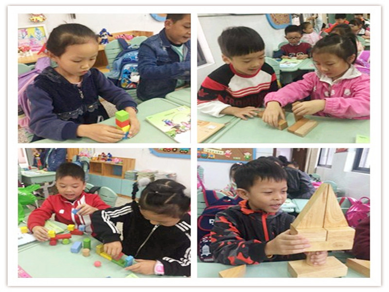 几个相同的形体堆一堆,看看哪组堆得稳、堆得好!一声令下,孩子们便开始忙活起来了。不一会儿,有的欣喜于堆得又高又快,有的苦恼于怎么堆都堆不起来。紧张的堆积中还不忘思考:为什么长方体、正方体能堆得很好,而球和圆柱不容易堆好呢?
