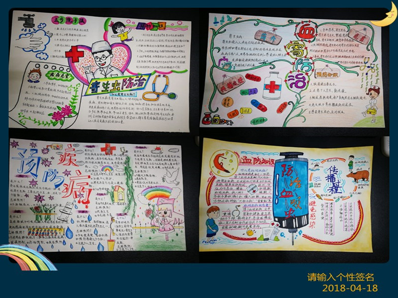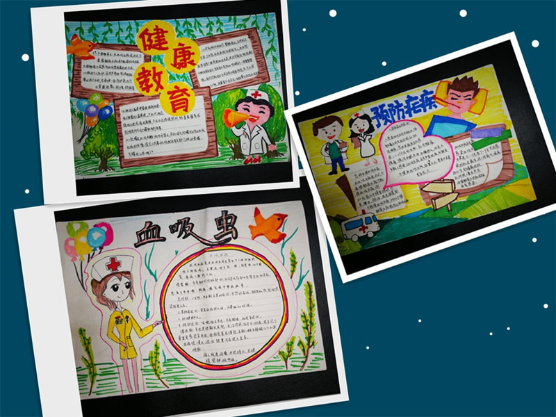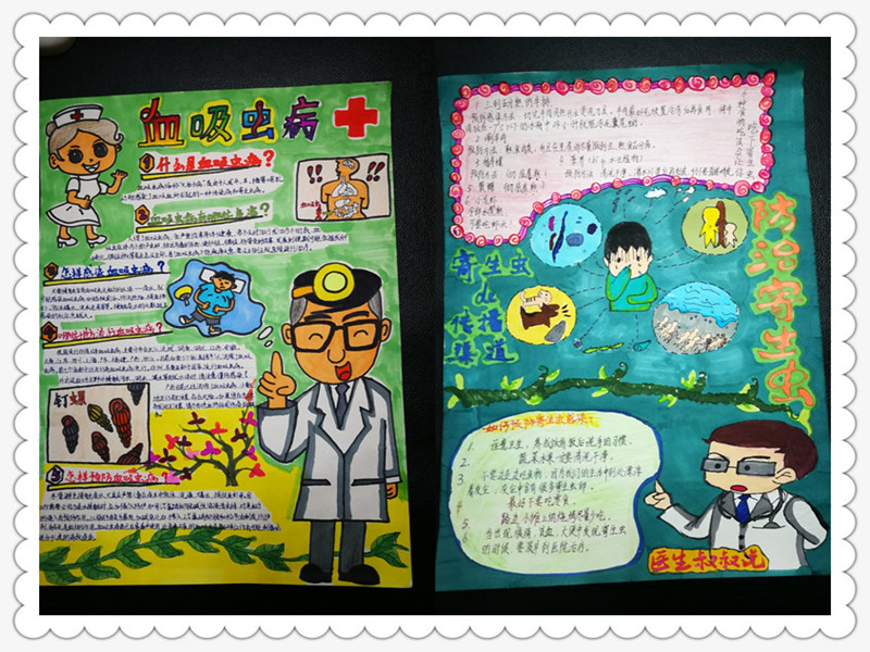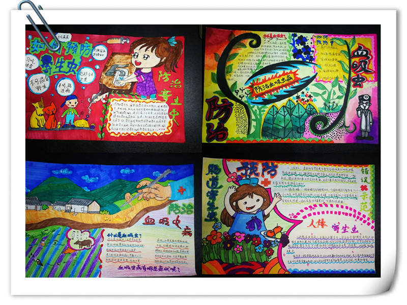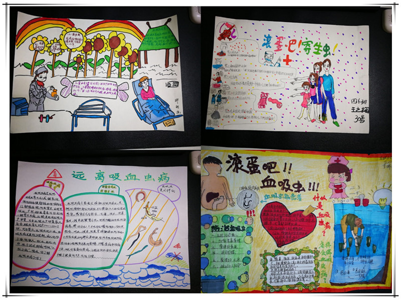 通过观看视频、学生做手抄报等形式普及血吸虫、寄生虫、地方病防治知识,了解外出游玩的防病知识和注意事项,哪些省份属于血吸虫的高发区,寄生虫的生长过程,感染寄生虫后的症状,不吃生食,不喝生水,不用切了生肉的砧板切直接入口的食物,从而养成良好的习惯和生活方式。