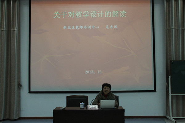 此次会议分为两大板块,第一板块为新北区教师培训中心羌杏凤校长为全校教师做了《关于对教学设计的解读》专题讲座,本次讲座围绕近期将要举行的省蓝天杯教学设计比赛展开。羌校长首先为大家明确了教学设计中的各个组成部分,然后就各组成部分为大家一一解读,并结合具体实例,进一步明确了各部分的详细要求。最后,羌校长结合自己以往的经验,和全体教师分享了自己的三点感悟:1、教学设计的内容必须正确;2、格式需规范;3、设计要创新。
