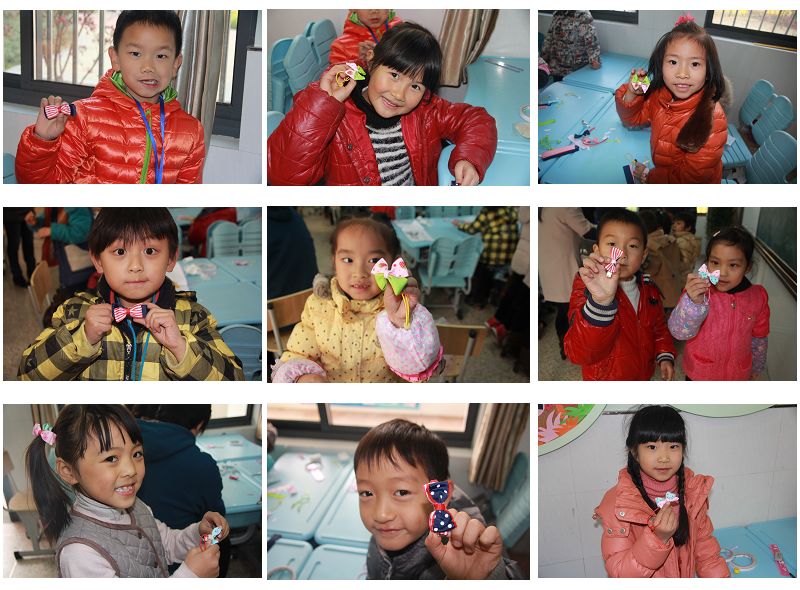 带上自己亲手制作的发夹、领花,手拉着手走到操场上,拉着小辫、,比着V手势,回眸一笑,开心跳跃,甜蜜依靠,牵着小手,伴着可爱……各种姿势展示着自己的风采,因为头上那飞舞的蝴蝶夹,因为领口夹着的那一个韩式领夹,因为胸前的胸花,因为袖口的花香……每一位宝贝都成了幸福的天使,每一个天使都是快乐的精灵,他们在操场上尽情绽放!