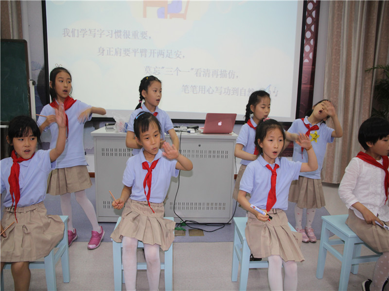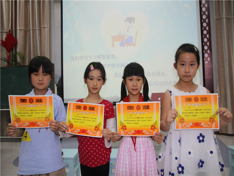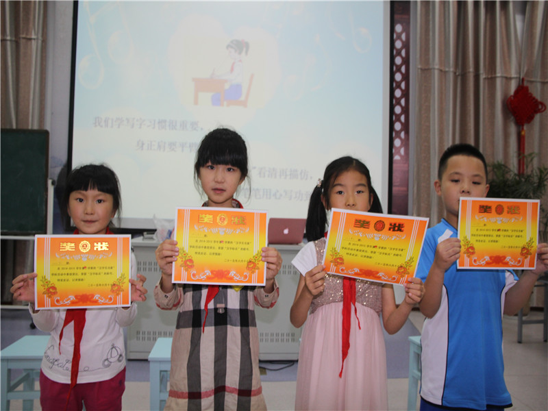 精彩的比赛环节落下了帷幕,评委们开始了最后的计分,一群阳光可爱的小龙娃迈着整齐的步伐上场,给所有一年级的小伙伴们献上了写字歌,一字一句蕴藏着写字的奥秘。孩子们声情并茂的表演让老师们会心一笑,让同伴们鼓掌叫好!与此同时,评委们也完成了计分,在孩子们的欢呼声中每班的代表上台从评委手中领取了属于自己班级的汉字标兵和汉字能手奖状。