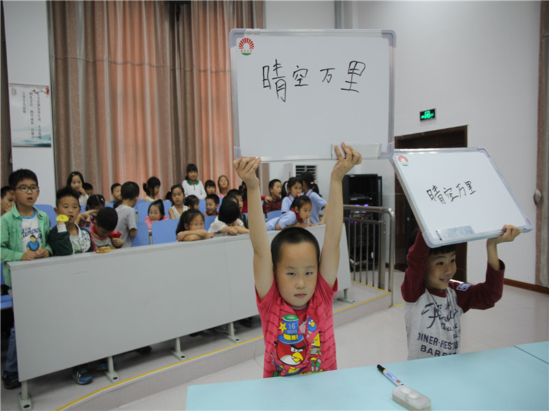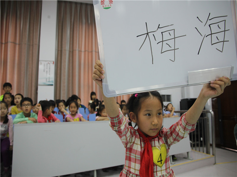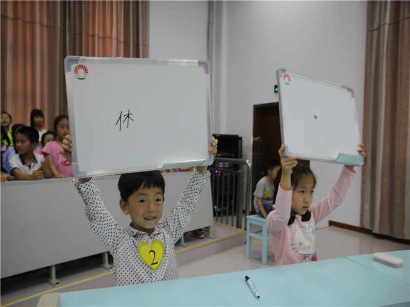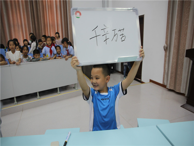 节奏明快的快板儿歌后小朋友们个个喜笑颜开,这时场上走来了八队参赛选手,他们是每班的汉字英雄,自信满满作为班级代表上场答题,一年级的老师们为孩子设计了精彩纷呈的猜字游戏:看图猜象形字、看字谜猜字、做动作猜字,小朋友们迅速接招,比赛和游戏齐头并进,寓学于乐。主持人冯华老师还走进了观众席的孩子们中间,和孩子们一起玩起了汉字对对碰,你来我往更是将现场的气氛推向了高潮。热闹的互动环节之后,冯老师还邀请了现场的八位同学参与挑战写成语,选手们争分夺秒地写下了自己的答案,评委们频频抬头计分。