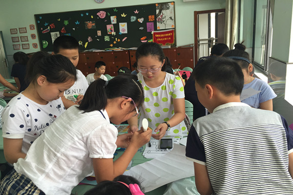 瞧!同学们做得多带劲!他们充分利用了带来的绘制材料、折折贴贴、拼拼剪剪,在合作中集思广益,展现集体的智慧。