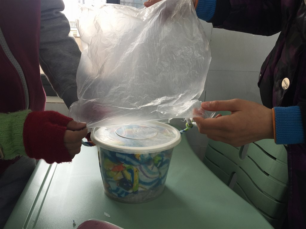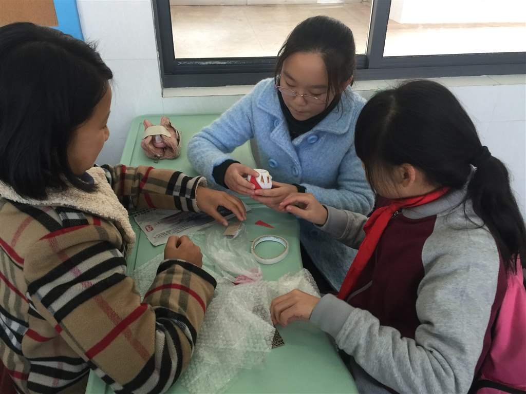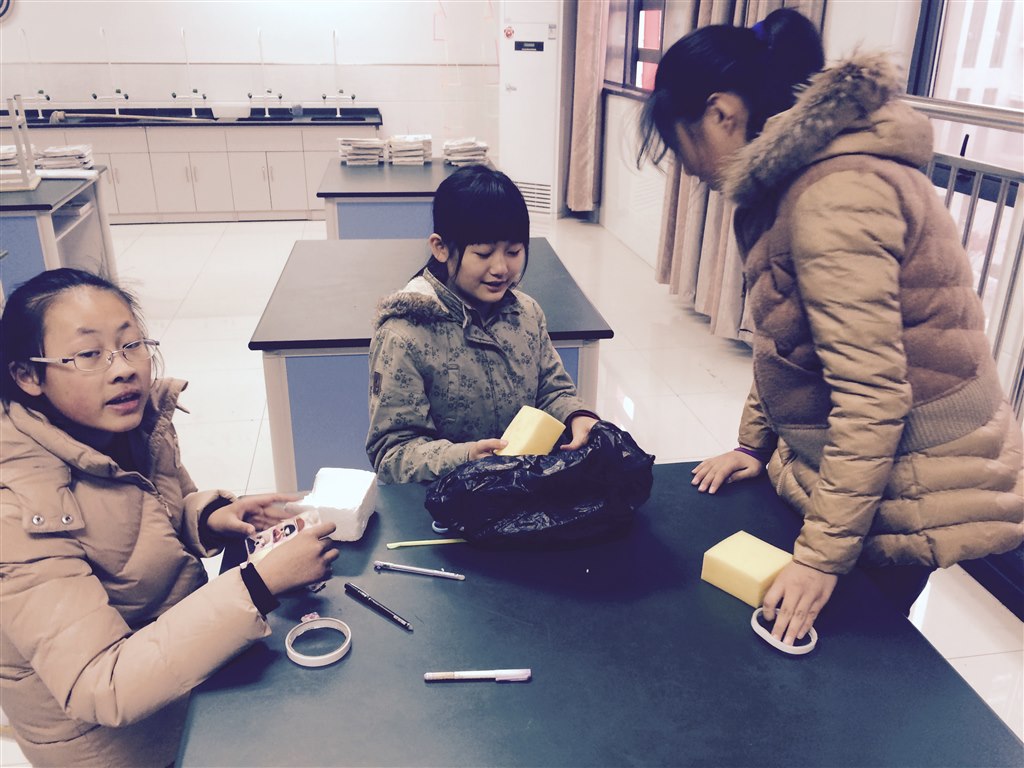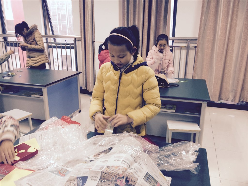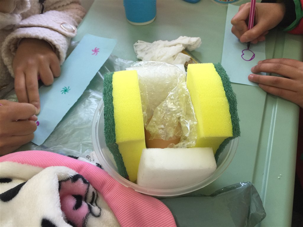 首先,要使鸡蛋撞地而不碎。这可难不倒我们五年级的小龙娃。你看他们找来了各种形状、材料、结构的容器来包装鸡蛋。为了降低鸡蛋撞击地面前瞬间的速度,还有的小朋友想到了在容器上包裹海绵、装降落伞等等。