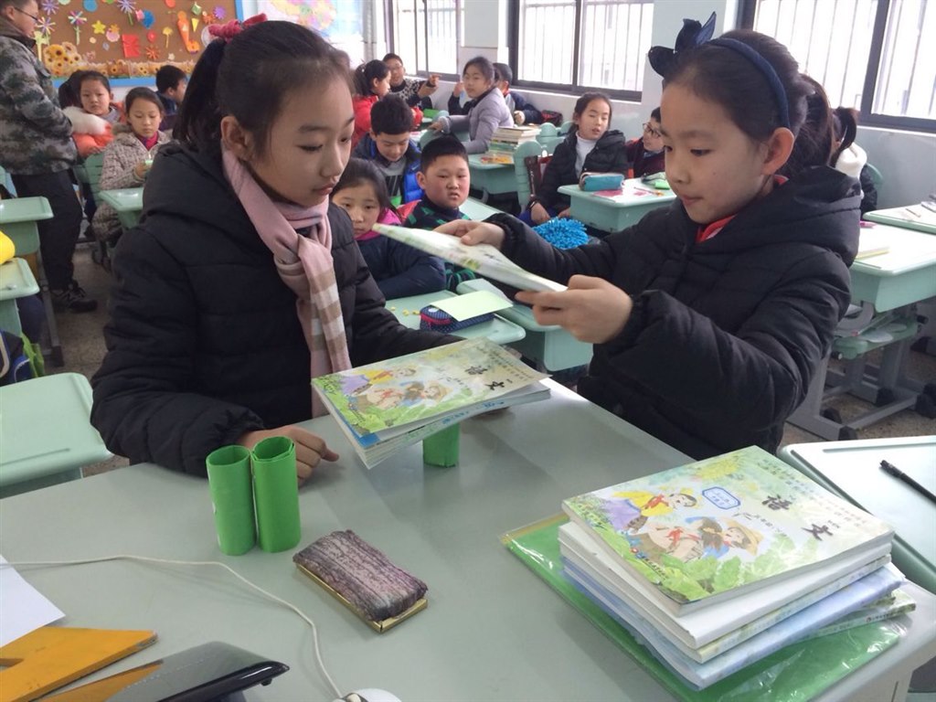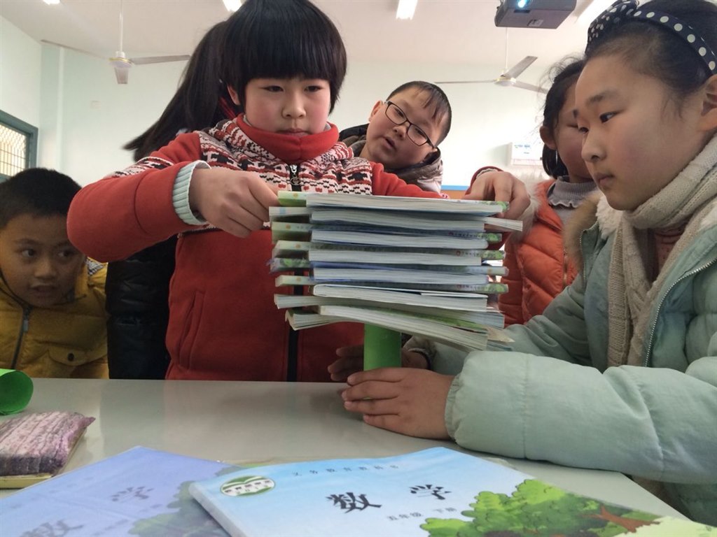 你会把一张纸立起来吗?孩子们一下子就想到了把纸折成不同的形状。那么哪种立体形状的折纸可以承受的重量最大呢?带着这个疑问,孩子们分组实验,在一次次的尝试中,“圆柱”力压群雄,一下子就打败了其他的形状,获得了第一名。