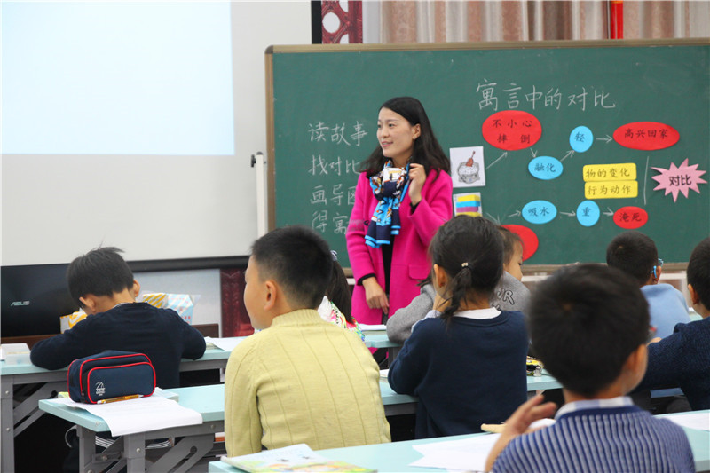 向爱芳、梁慧慧两位老师分别以神话类类文和寓言故事类类文为抓手,向大家呈现了两节多元化的类文阅读课,为日常教学打开新思路。向爱芳老师带来了《走进神话世界》,通过读句子、想画面的方法品读《大禹治水》和《女娲补天》两篇神话故事的情节,感悟大禹、女娲不怕辛苦、为民造福的人物形象,并通过对比发现神话“类人物”共同的形象特质,感受中国古代神话故事的丰富多彩。课堂上,通过小小配音师、简笔画、颁发证书等活动,调动了孩子的积极性,鼓励学生大胆质疑、独立思考,让孩子喜欢表达、乐于表达!美国图论学者哈里有一句名言:“千言万语不及一张图。”思维导图能提供一个有效的工具,运用图文并重的技巧,开启人类大脑的无限潜能。梁慧慧老师就将思维导图引进课堂,带着孩子们比较阅读《驮盐的驴》、《自作聪明的墨鱼》、《松鼠和松鸡》三篇寓言故事,领悟寓言“对比”的表现手法,运用思维导图梳理故事脉络,明事理,知寓意,让孩子们充分感受阅读寓言故事的乐趣。“授人以鱼不如授人以渔”的方法指导,让学生们领会了一种全新的阅读方法。