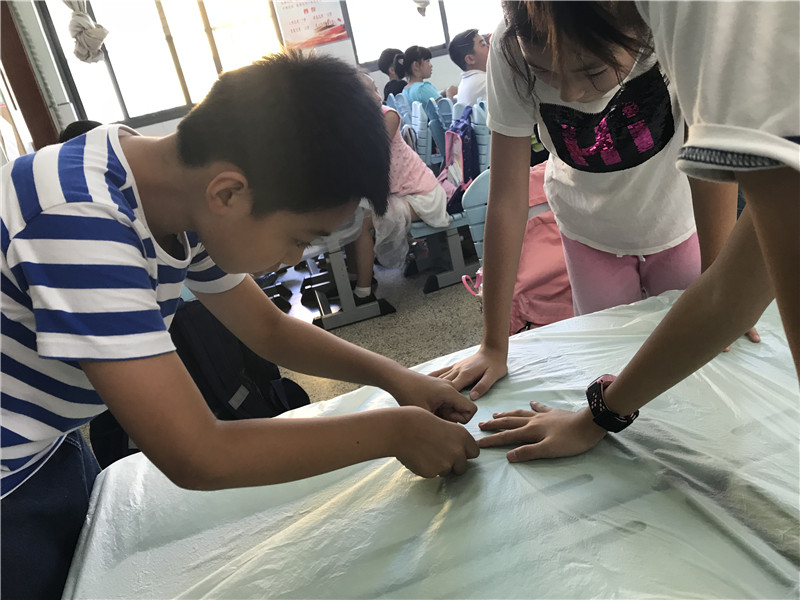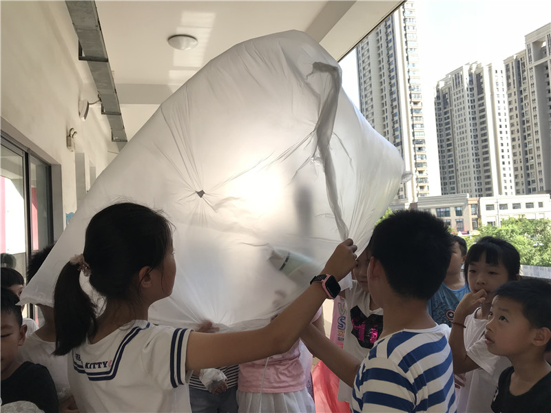 一块正方形的塑料桌布,经过大家灵巧双手的一剪、一折、一贴,就变成了一个方方正正的塑料包,只在一侧留下了一个小小的口子。再看小龙娃们,大大的眼睛里藏满了问号,“这个其貌不扬的东西,真能像热气球一样飞上天吗?”