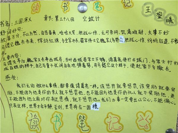 通过将近一个月的共读活动,孩子们自信大方地走上讲台,向大家大声朗读一个精彩片段或者讲述一个经典故事,谈自己的感受感想。对“三国”的人物故事,有了深入的了解,并在交流与感悟中,分享了阅读情趣,提高了语言组织等能力。孩子们分享自己的读书笔记和手抄报,走进名著“三国”,品读“三国”人物,开启经典阅读之旅。(图文/刘叶蓉 )