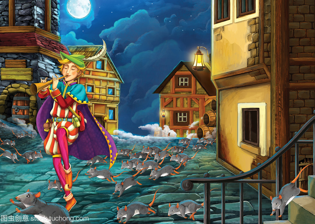 《哈梅林的花衣魔笛手》根据欧洲古老的民间传说改编。传说,在德国普鲁士的哈梅林(Hamelin)曾发生鼠疫,死伤极多,居民们束手无策。后来,来了一位法力高强的魔笛手,身穿红黄相间的及地长袍,自称他能铲除老鼠。镇子里的首脑们答应给他丰厚的财宝作为答谢,魔笛手便吹起神奇的笛子,结果全村的老鼠都在笛声的指引下跑到了河里,全部被铲除。但是那些见利忘义的首脑们却没有兑现承诺,拒绝付给他酬劳。为了进行报复,花衣魔笛手就又吹起神奇的笛子,全村的小孩都跟着他走了,从此便无影无踪。