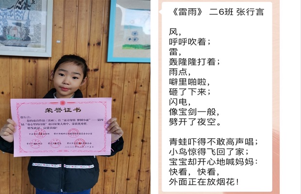在童诗征集大赛中,我校唐旎老师指导的二(6)班张行言同学的诗歌作品《雷雨》、沈佳敏老师指导的六(5)班何沛宸同学的诗歌作品《奋斗的云》荣获优秀奖。让我们一睹他们的风采吧!
